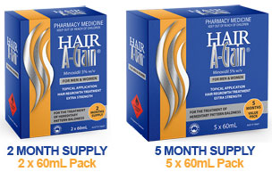 Hair A-Gain is available in two pack sizes: 2 x 60mL (2 months supply) and 5 x 60 mL (5 months supply). Each pack contains one child-resistant dropper applicator. Hair A-Gain is available without a prescription from your local pharmacy.